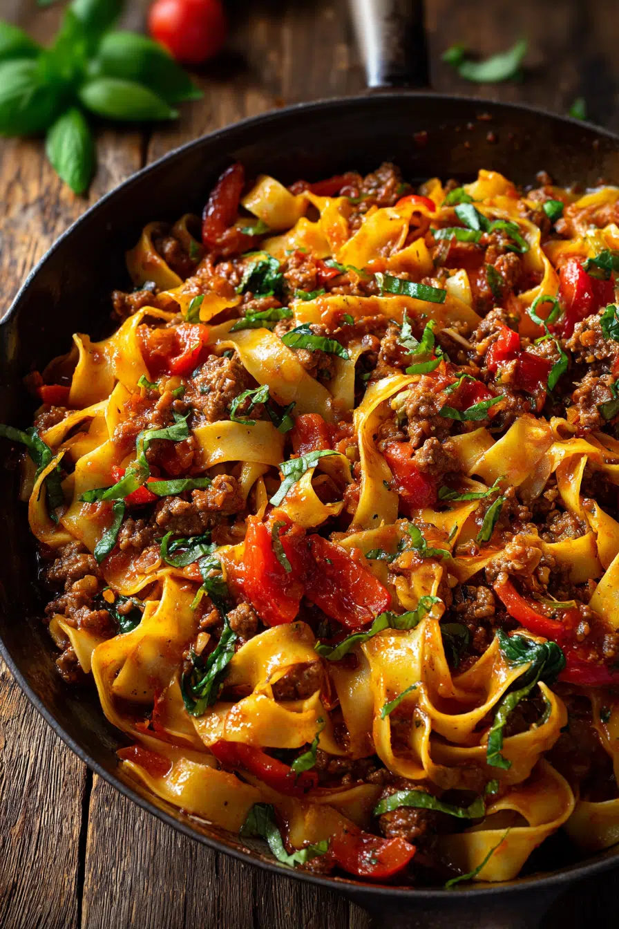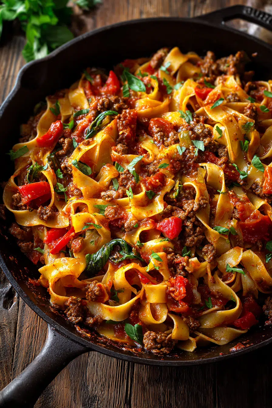I first made this recipe on a chilly weeknight when I had a handful of pantry ingredients, a bottle of red wine already open on the counter, and a serious craving for something warm and cozy. What came out of that skillet was pure magic — tender noodles coated in a rich, wine-kissed sauce, juicy tomatoes bursting with sweetness, and layers of Italian herbs that made it feel like something you’d order at a tiny trattoria tucked away on a quiet street in Rome.