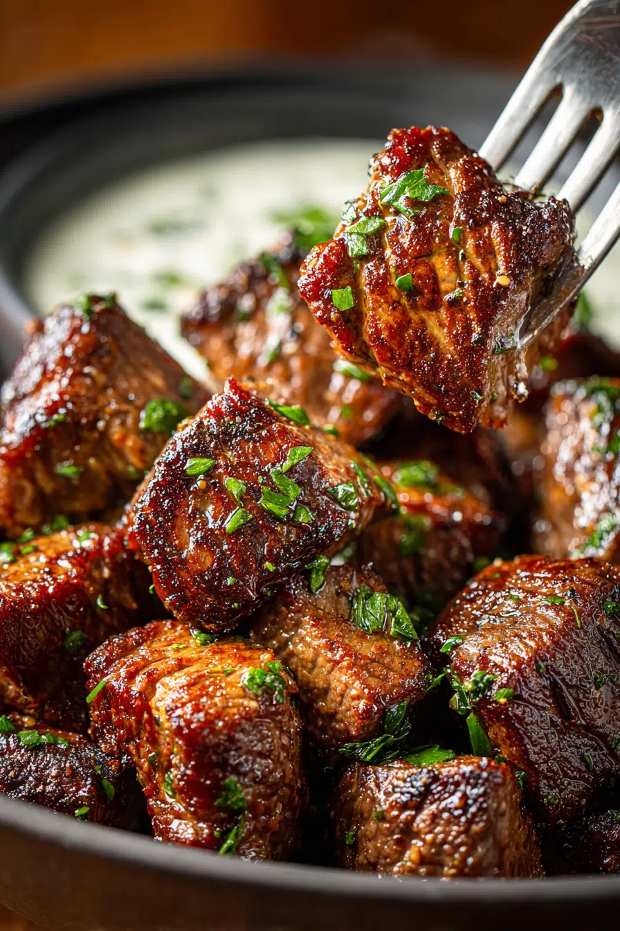 By cutting the steak into bites and searing in a hot pan, you lock in the juices, ensuring tender, melt-in-your-mouth bites.