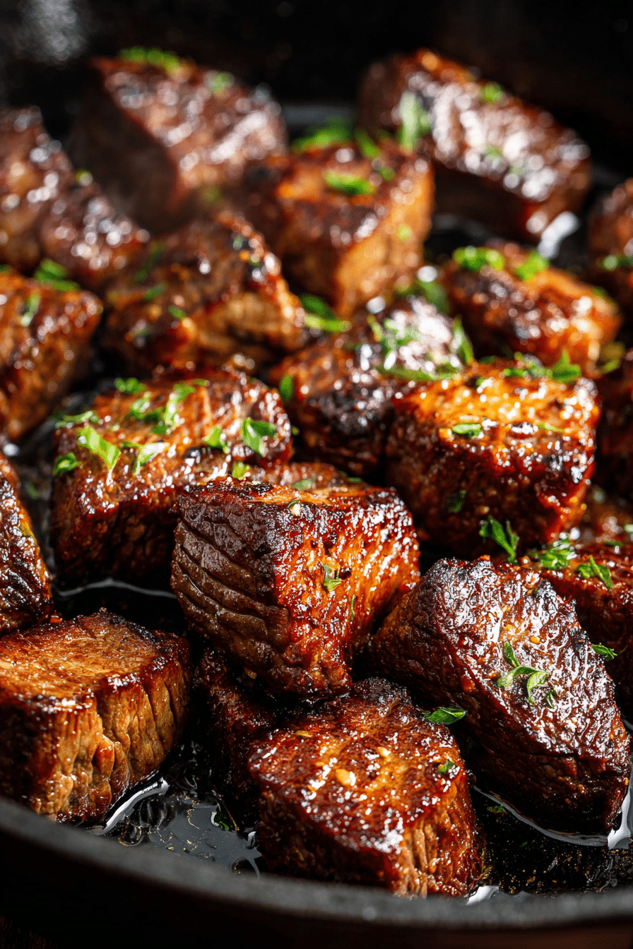 Lower the heat slightly. Add minced garlic and butter to the pan. Spoon the melted garlic butter over the steak bites continuously for 1–2 minutes, coating every piece.