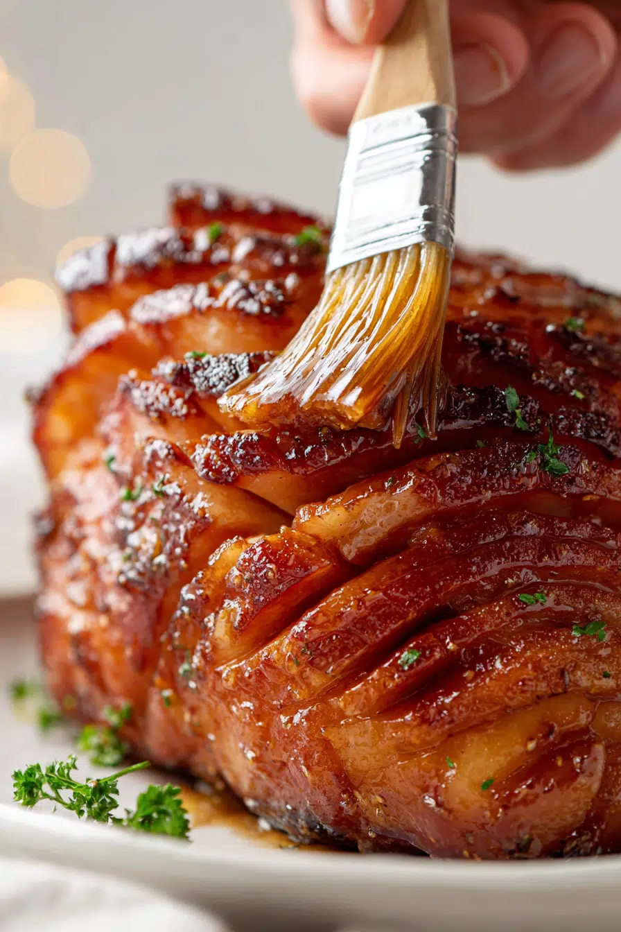 Bake ham uncovered for 1–1.5 hours, basting every 20 minutes with remaining glaze. Watch the glaze caramelize into a deep amber color and fragrant aroma.