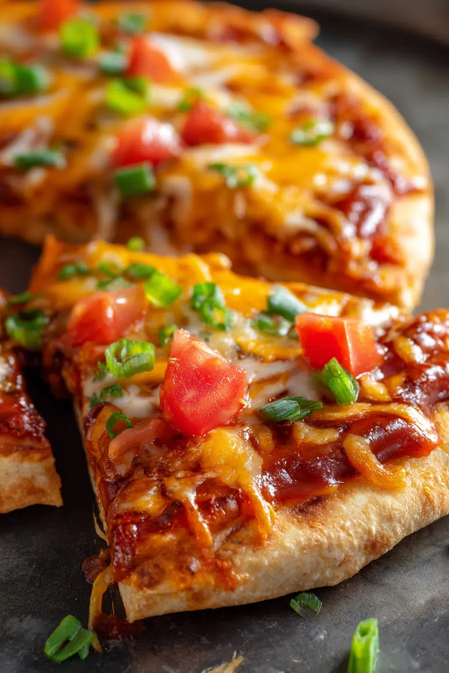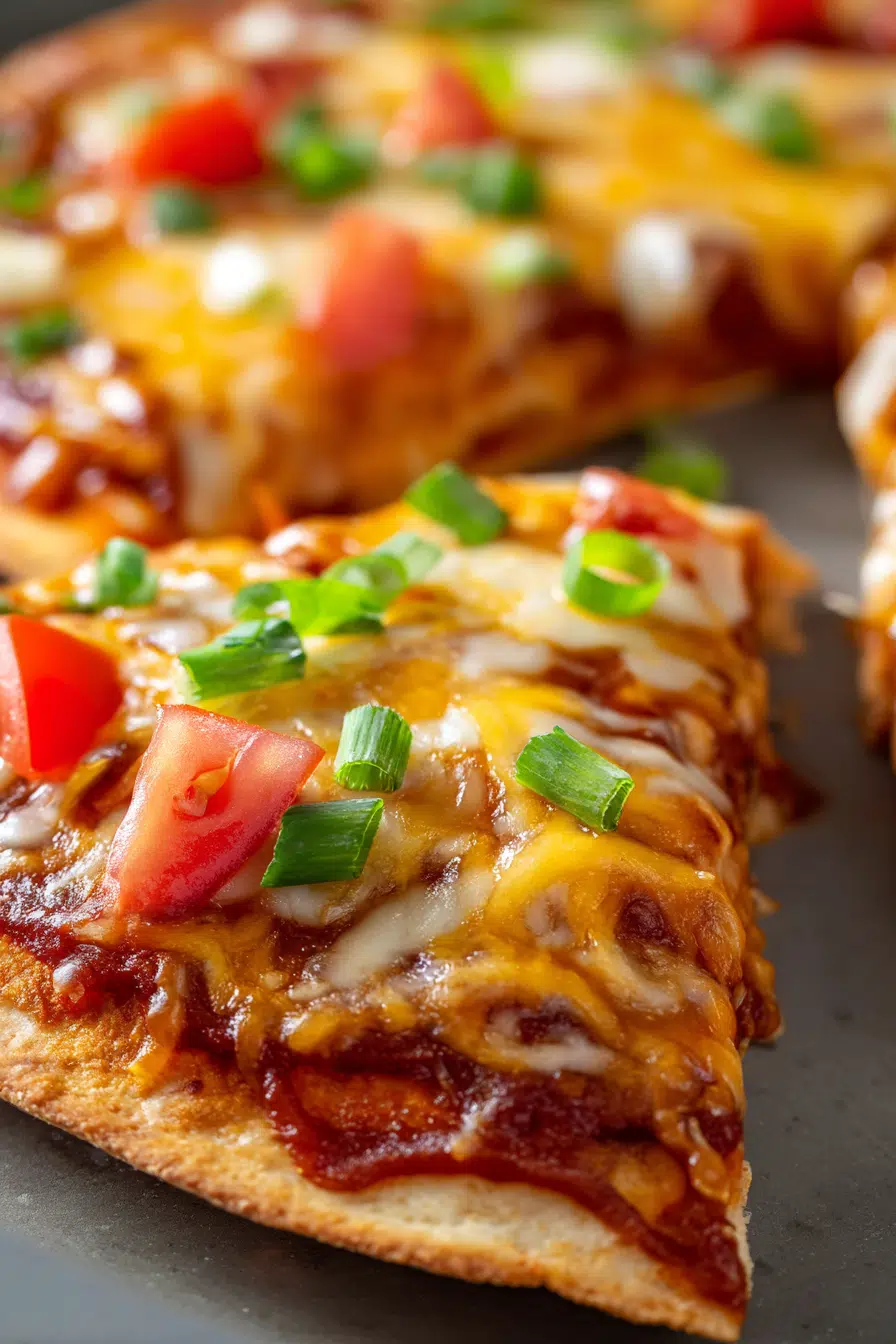 Remove from the oven and scatter diced tomatoes and green onions over the top. Let the pizza rest for 3 to 4 minutes so the layers set and slice cleanly.